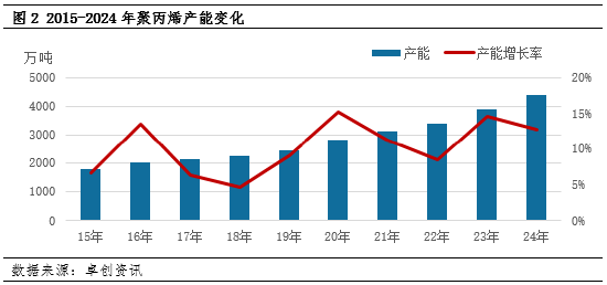 近年来,聚丙烯行业的产能保持高速增长,卓创资讯数据显示,至2024年聚丙烯产能达到4382万吨,较2015年增长2604万吨,增幅146%,较2020年增加1566万吨,增幅55.61%。