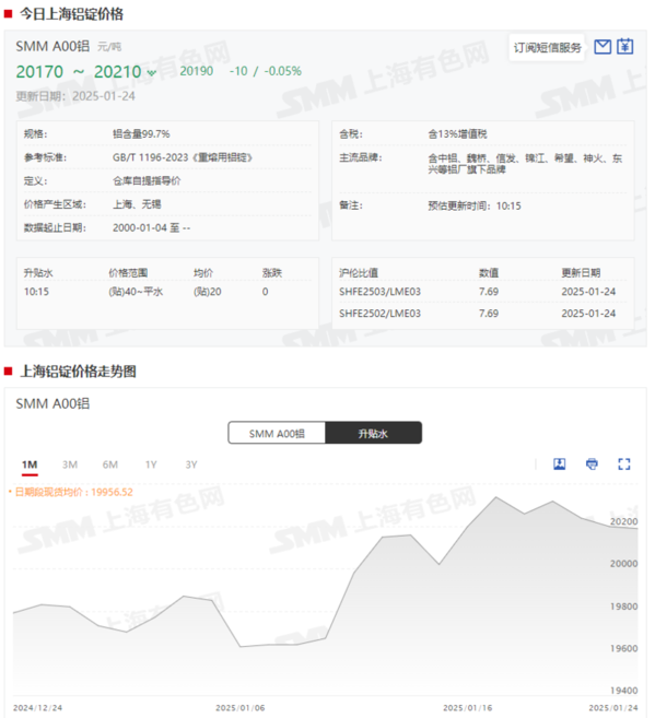 现货方面,截至1月24日,SMM A00铝现货报价跌至20170~20210元/吨,均价报20190元/吨,较1月17日的20340元/吨下跌150元/吨,跌幅达0.74%。