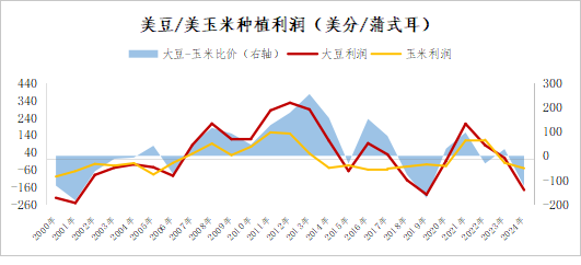 一、当前美豆种植利润亏损明显,美玉米虽有亏损但程度较轻,25年美国农民或增加玉米种植面积,减少大豆种植,届时全球大豆供应或下降。