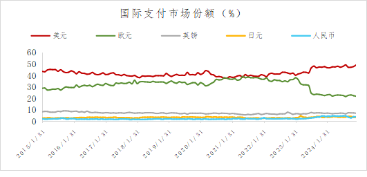 然而,从下图可以看出,美国在其经济强、利率高、美股不断上涨等因素加持下,美元依旧在全球交易中占据最大的份额,因此“去美元化”是必然趋势,但也是长期的过程。