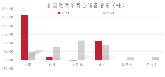 此外,作为购金主力的国内央行,在24年6月以后已经连续6个月未增加黄金储备,在11月才重新开始增加黄金储备,但其它发展中国家黄金储备的增加是24年黄金上涨的主要推动力。后续央行购金或持续,是黄金价格的主要支撑之一。