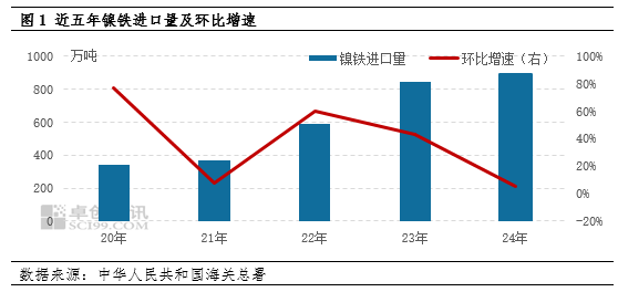 回顾2024年,印尼镍铁、MHP和高冰镍冶炼项目对应镍矿消耗合计约2.5亿吨,2025年新增配额占比接近25%,这对镍市场供应会形成较大冲击。以镍铁为例,近五年回流量持续增长,平均增速接近40%,其中2024年镍铁进口量中有96.51%来自印尼。换言之,印尼地区镍矿配额的增加会对明年镍产品回流增量提供支撑,因此镍市场供应压力依旧存在,全年镍价有测试10万元/吨支撑可能。