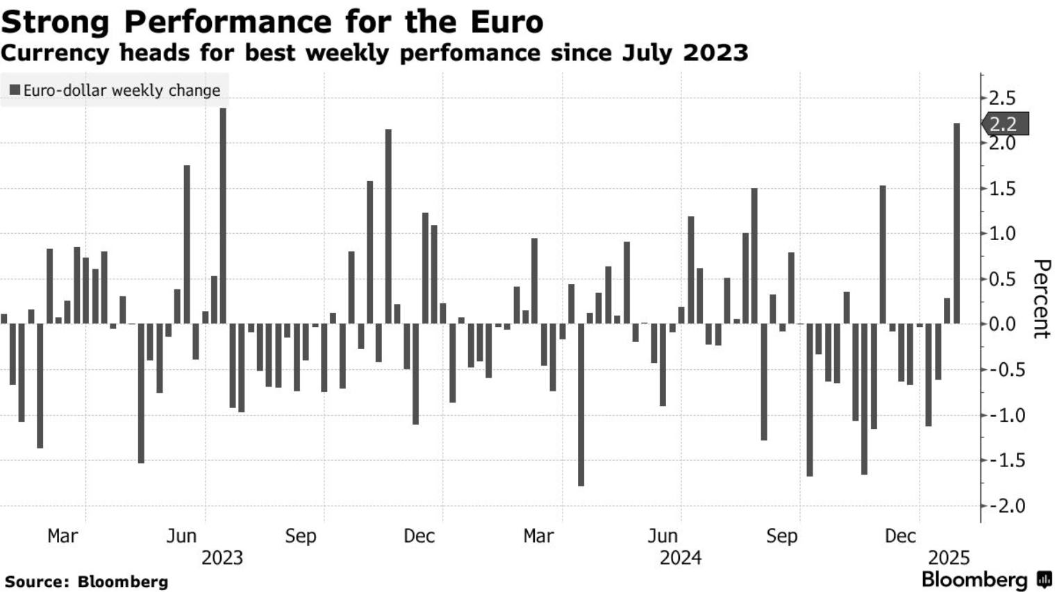 在投资者降低对降息的预期,并押注美国贸易关税不会像之前担心的那样迅速生效后,欧元有望创下一年多以来的最佳单周表现。欧元本周有望上涨约2%,达到1.0515美元,这是自2023年7月以来的最大涨幅。这一走势部分得益于美元的走弱,美元兑一篮子主要货币正经历14个月来最糟糕的一周。