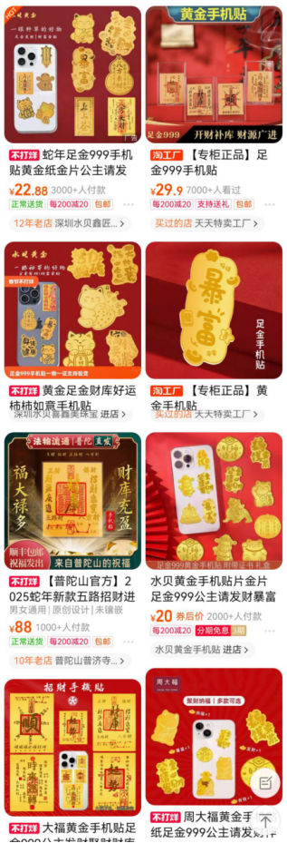 在各大电商平台,搜索黄金手机贴,各种款式令人眼花缭乱。有印着“公主请发财”“时来运转”等吉祥字样的,还有可爱的财神爷、招财猫图案,以及与哆啦A梦、Hello Kitty、甄嬛传等知名IP的联名款,满足了年轻人对个性化和美观的追求。