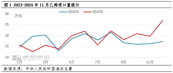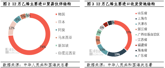 12月乙烯进口量环比同比皆明显增长,进口量创年内最高。海关总署数据显示,12月乙烯进口量27.12万吨,环比增长37.91%,同比增长57.41%。月内进口环比增加,主要原因在于部分区域如山东国内需求增加,对于进口的需求同步增长。