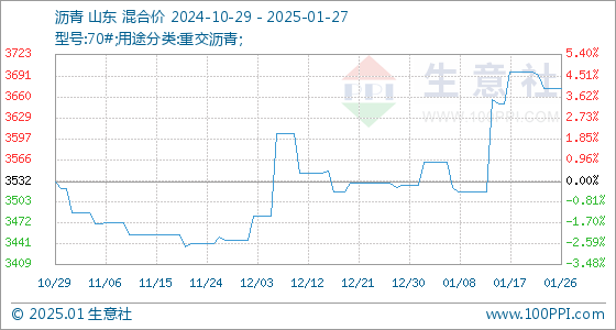 1月27日,生意社沥青基准价为3673.20元/吨,与本月初(3528.00元/吨)相比,上涨了4.12%。