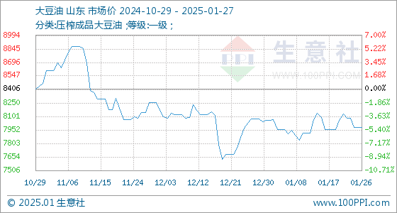 1月27日,生意社大豆油基准价为7978.00元/吨,与本月初(8056.00元/吨)相比,下降了-0.97%。