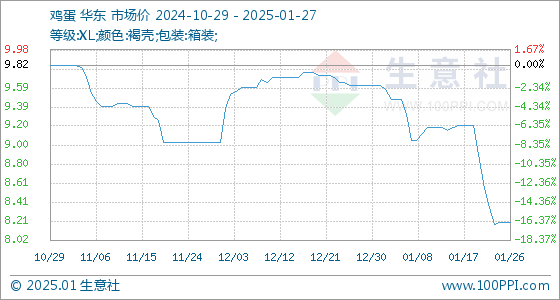 1月27日,生意社鸡蛋基准价为8.20元/公斤,与本月初(9.62元/公斤)相比,下降了-14.76%。