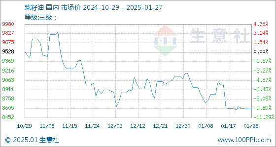 1月27日,生意社菜籽油基准价为8591.67元/吨,与本月初(9178.33元/吨)相比,下降了-6.39%。