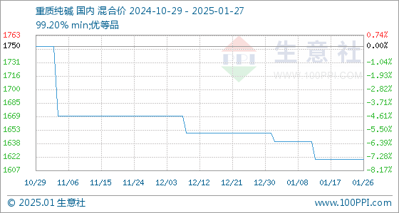 1月27日,生意社重质纯碱基准价为1620.00元/吨,与本月初(1650.00元/吨)相比,下降了-1.82%。