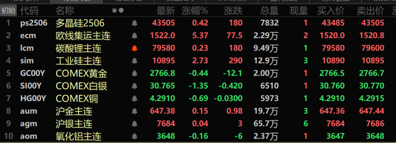 此外,氧化铝跌0.16%。碳酸锂涨0.23%,工业硅涨2.73%。多晶硅主力期货涨0.42%。