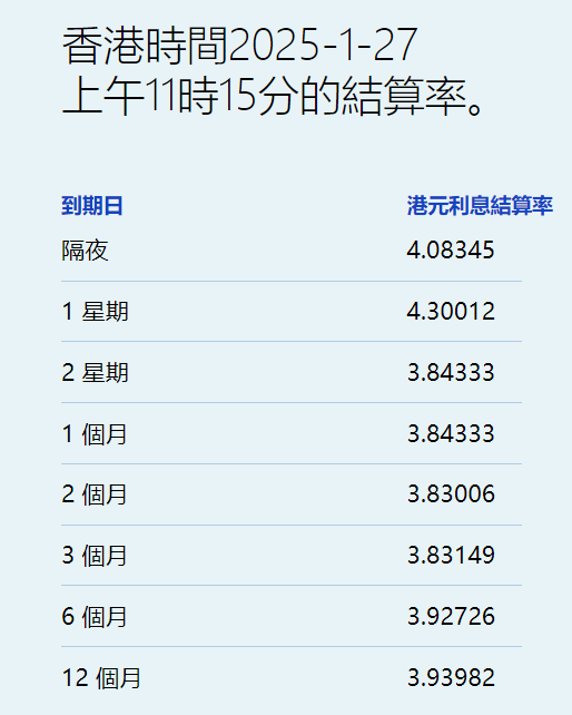 1月27日,临近春节假期流动性紧张,港元两个月及以下拆息继续全线反弹,其中,隔夜息升近92基点至4.08345%,创近三周新高。与楼按相关的一个月拆息连升两天,报3.84333%,为1月22日以来最高。