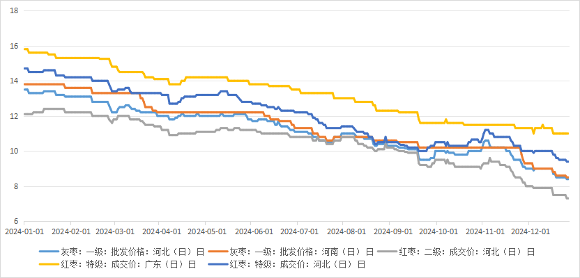 2024年1月2日红枣主力2405收盘价15120元/吨,截至2024年12年24日主力2505收盘价9410元/吨。全年主力合约盘面价格下降5710元/吨,降幅37.76%。同期文华农产品板块下降6.67%,文华商品指数下降7.13%。红枣主力合约下降幅度偏大,下降程度超越大部分商品品种。