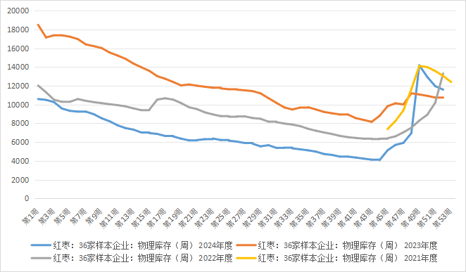 2024年下树时间推迟,并且春节提前,旺季时间较2024年缩短20天,年前的消费量预估在20-25万吨,年后则面临45-50万吨的库存压力,相对较大,由旺季转淡季的阶段可能会经历一个探底的过程。根据2022-2023年产季情况,2024年的红枣产量较2022年有所增加,但收购主体较为分散,商品率低,理论上有利于消费端的放量,若明年出现以红枣为原料的爆款新产品,其需求或将出现明显增长,预计2025年红枣盘面的底部强支撑在8500元/吨附近。由于2024年枣农收入不高,2025年种植积极性可能会受到抑制,进而可能导致2025/2026年度红枣产量出现回落,建议2025年5月份以后关注新一产季的产量情况。