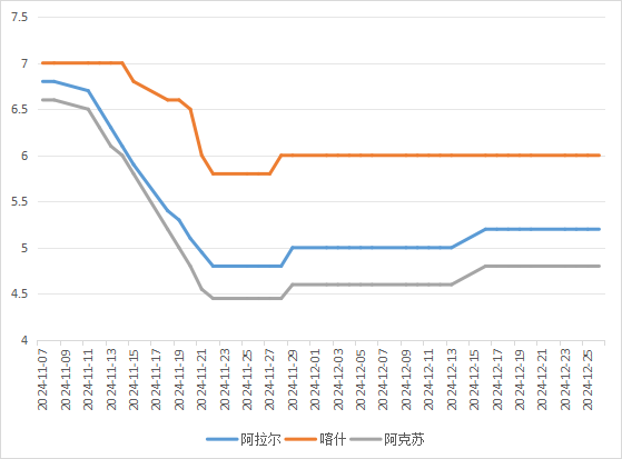 新疆主产区灰枣原料价格走势呈现高开低走之后反弹行情,开称价格符合定产期预判,主产区灰枣原料收购均价在5.33元/公斤。产区收购初期高价在8.50-10.00元/公斤,企业及客商挑选好货适当性采购,随着收购的进行枣农多顺价出货,收购尾声价格围绕5.00-7.00元/公斤,随后主产区阿克苏价格从初期的6.50-7.00元/公斤回落至4.00-4.90元/公斤后企稳;喀什地区下树开称时间较晚,开秤价格在5.80-6.20元/公斤,回落至5.00-6.00元/公斤。新季灰枣收购结构较去年有着明显的不同,2023产季收购价格一路高走,主产区原料均价在10.60元/公斤,货权主要锁定在疆内大企业,内地客商占比少量。2024产季6成货权分散在内地企业及中小客商,新疆企业总占比减少,从新季收购情况来看,收购初期客商及企业按兵不动,从边缘产区若羌、且末、皮山等地入手,由于成本较高多作为土枣原料,内地客商收货主力片区集中在阿克苏、阿拉尔,企业收购主力地区集中在兵团第三师,收购在11月23日前后展开,价格不断下调枣农顺价出货,收购进程快、时间短,从按兵不动到一抢而空仅2周左右,目前产区余货零星价格坚挺不足以影响主流行情。