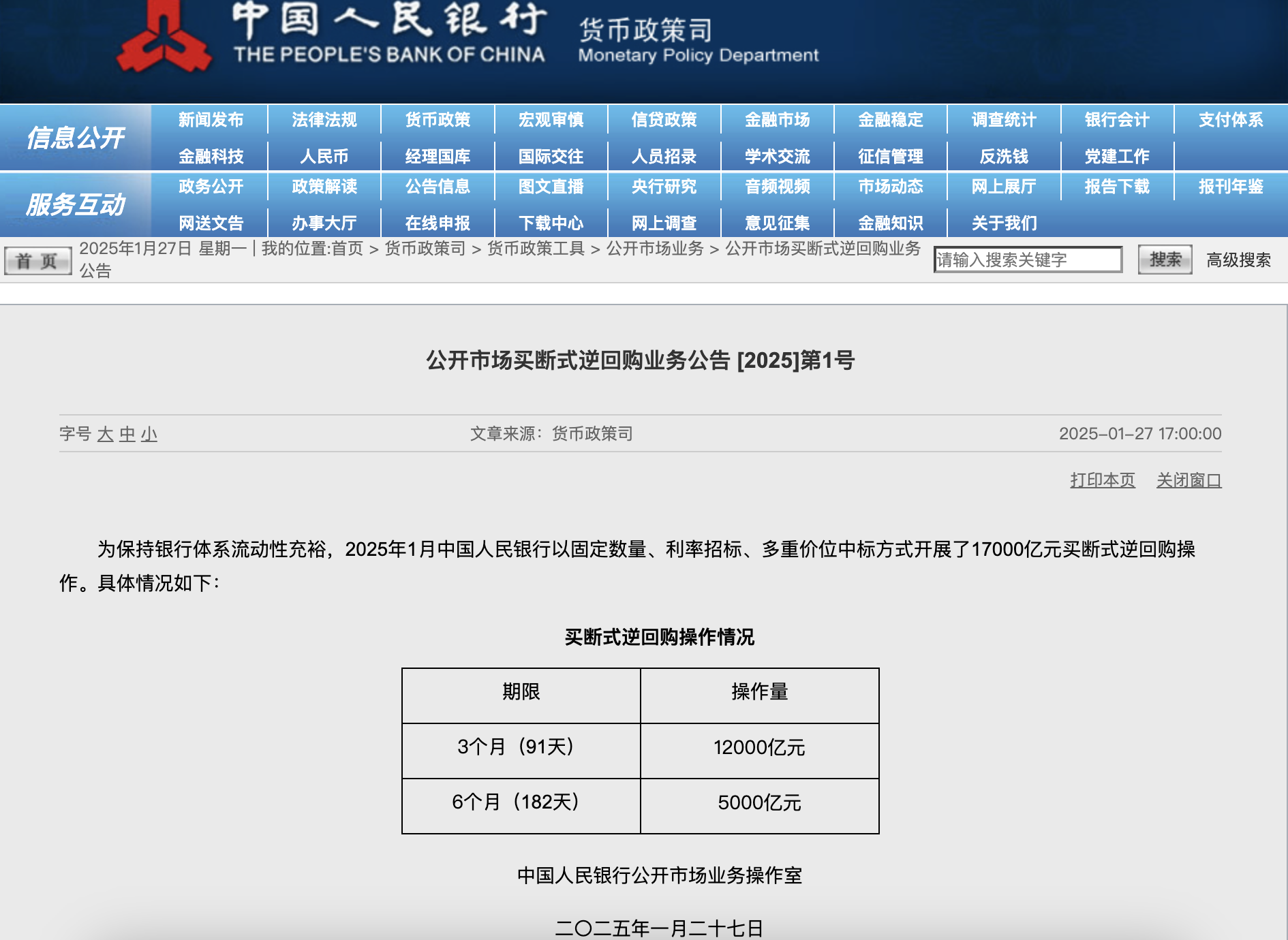 央行:2025年1月开展了17000亿元买断式逆回购操作