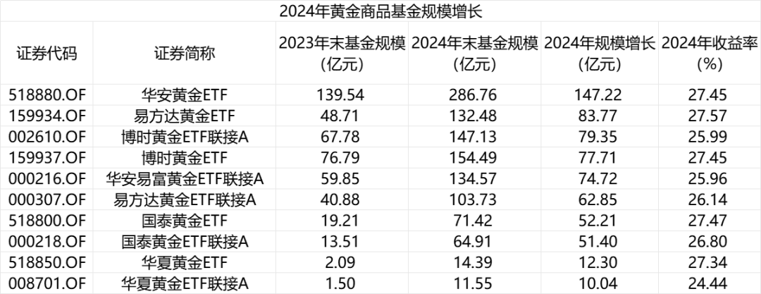 从规模增长数值来看,华安黄金ETF规模增长最多,2024年规模增长147.22亿元,总规模达286.76亿元,成为全市场规模最大的商品型基金。此外,易方达黄金ETF、博时黄金ETF联接A、博时黄金ETF、华安易富黄金ETF联接A规模增长均超70亿元,总规模均超百亿。