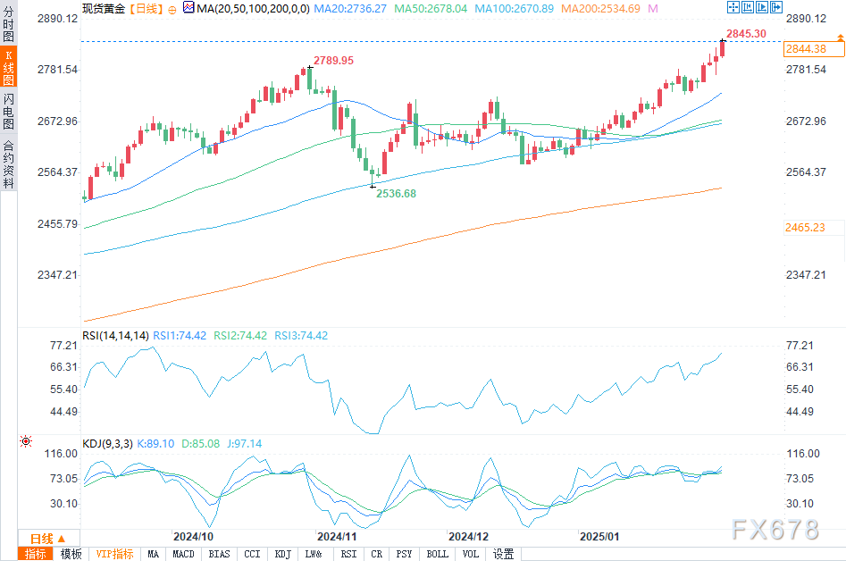 汇通财经APP讯——黄金价格飙升至创纪录的新高(2844美元),金价的持续上涨将相对强弱指标(RSI)推至超买区域。