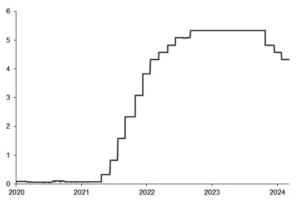 为应对通胀飙升,美联储在2022年3月启动了上一轮加息周期,其间一共11次提高利率,最终令联邦基金利率区间升至5.25%~5.5%的22年来最高水平。从2023年9月开始,美联储维持利率不变,直至2024年9月美联储4年来首次降息,而且大幅度将利率直接下调50个基点。之后美联储再降息2次,每次降息25个基点,令利率达到两年来最低。
