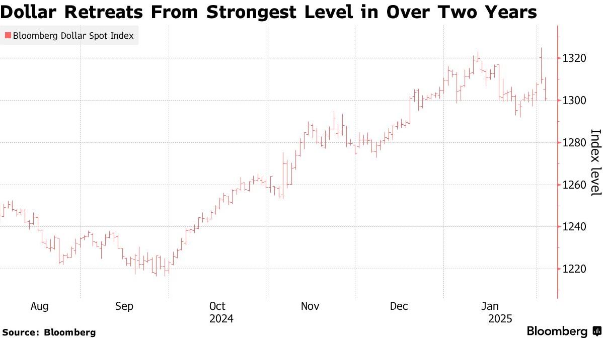 交易员们押注,鉴于美国经济相对强劲以及贸易战可能迫使投资者进入避险资产的背景下,美元2月5日的暴跌可能是短暂的。2月5日,彭博美元现货指数下跌0.7%,结束了此前连续六个交易日的上涨势头。该指数此前在本周初的亚洲交易中达到2022年以来的最高水平,当时投机者为定于2月1日生效的美国关税做好准备。然而,美国总统唐纳德·特朗普在2月4日决定推迟对墨西哥和加拿大征收关税,美元回吐涨幅,目前美元指数略低于上周收盘价。