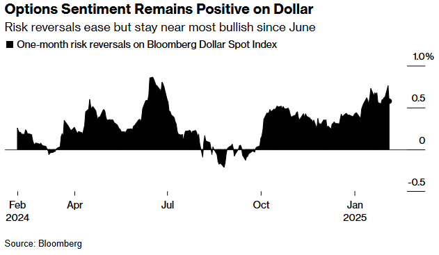 期权市场中衡量美元人气的指标仍接近七个月以来的最高水平。摩根大通策略师帕特里克·洛克等指出,到目前为止,他们还没有看到衍生品市场中美元多头仓位普遍平仓的证据。