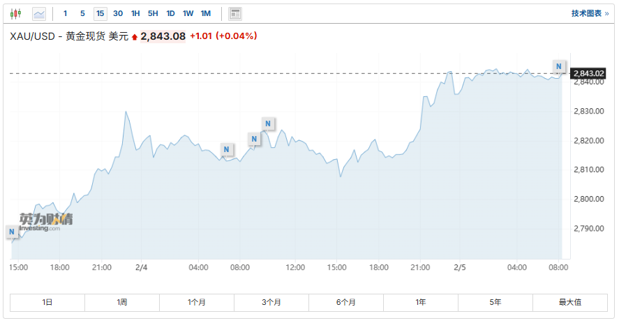 2月5日,黄金价格重新回升至历史新高,主要原因是市场避险情绪升温。在中国对美国征收关税以报复美国总统唐纳德.特朗普的关税政策后,投资者纷纷寻求避险资产。截至发稿,现货黄金上涨0.04%,至每盎司2,843.08美元,盘中早些时候触及2,845.14美元的历史高位。美国黄金期货收盘上涨0.7%,至2,875.80美元。
