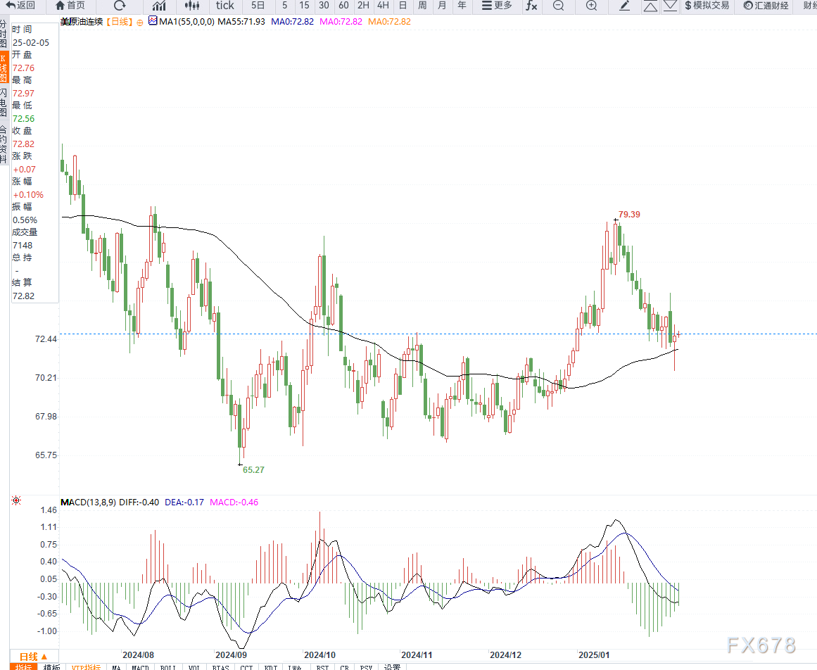 汇通财经APP讯——周三(2月5日)美原油亚盘时段延续上涨,交投于72.88美元/桶附近,基本面上贸易冲突施压油价,使得短期波动率进一步放大。