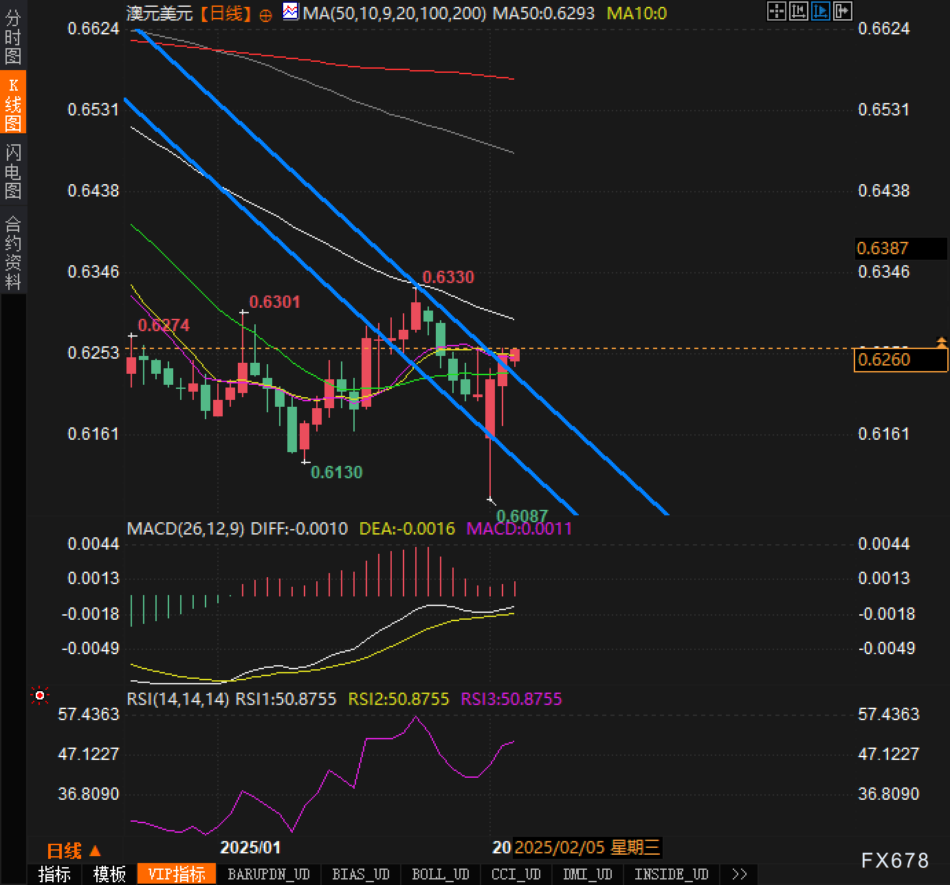 综合来看,澳元/美元目前面临诸多挑战,基本面上受到澳大利亚经济增长放缓以及澳洲联储降息预期的影响,短期内可能仍会维持弱势。技术面上,虽然RSI保持中性,且存在一定支撑位,但若无法持续突破下降通道的上轨,仍可能继续保持震荡下行的态势。