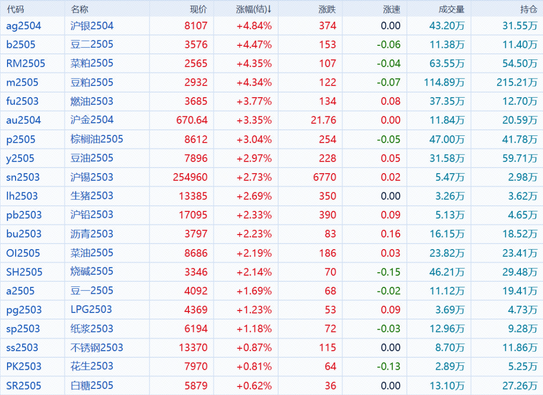 2月5日,午盘收盘,国内期货主力合约涨跌不一。沪银、豆二、菜粕、豆粕涨超4%,燃料油、沪金、棕榈油涨超3%,沪锡、生猪、烧碱、沪铅涨超2%,液化石油气(LPG)、纸浆涨超1%;跌幅方面,集运欧线跌超8%,苹果、氧化铝、焦炭、玻璃跌超3%,尿素、硅铁跌超2%,热卷、碳酸锂、螺纹钢、橡胶、PVC跌超1%。