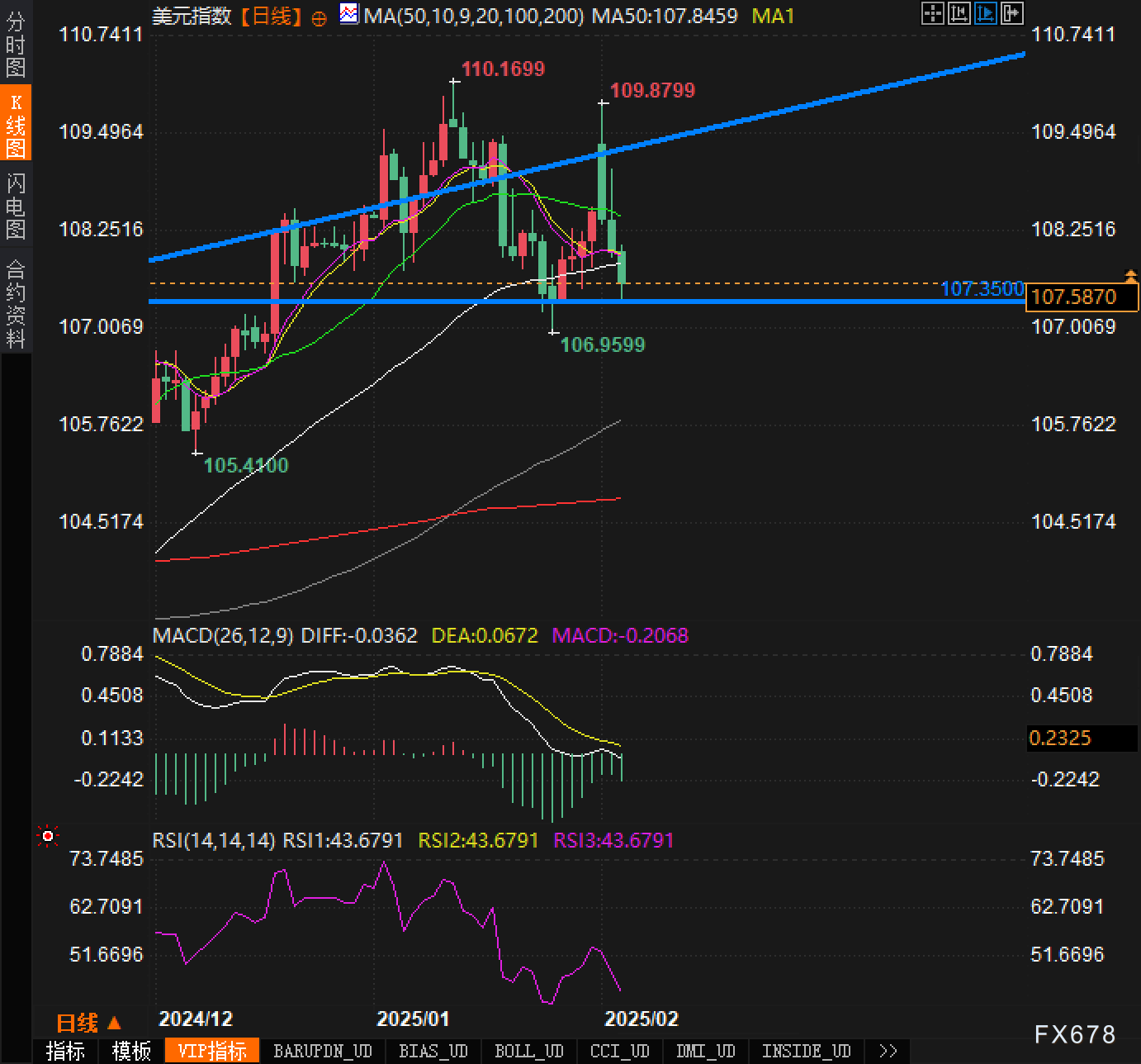 总的来说,美元指数在经历了短期的上涨后,正处于一个下行修正的阶段。基本面上,特朗普暂停对墨西哥和加拿大的关税政策缓解了市场的紧张情绪,导致美元的避险需求减弱。技术面上,美元指数正面临关键支撑位的考验,107.35一线的支撑作用依然存在,但若跌破该位置,美元可能会继续走低。市场密切关注即将发布的美国PMI数据,这可能成为决定美元短期走势的一个重要因素。