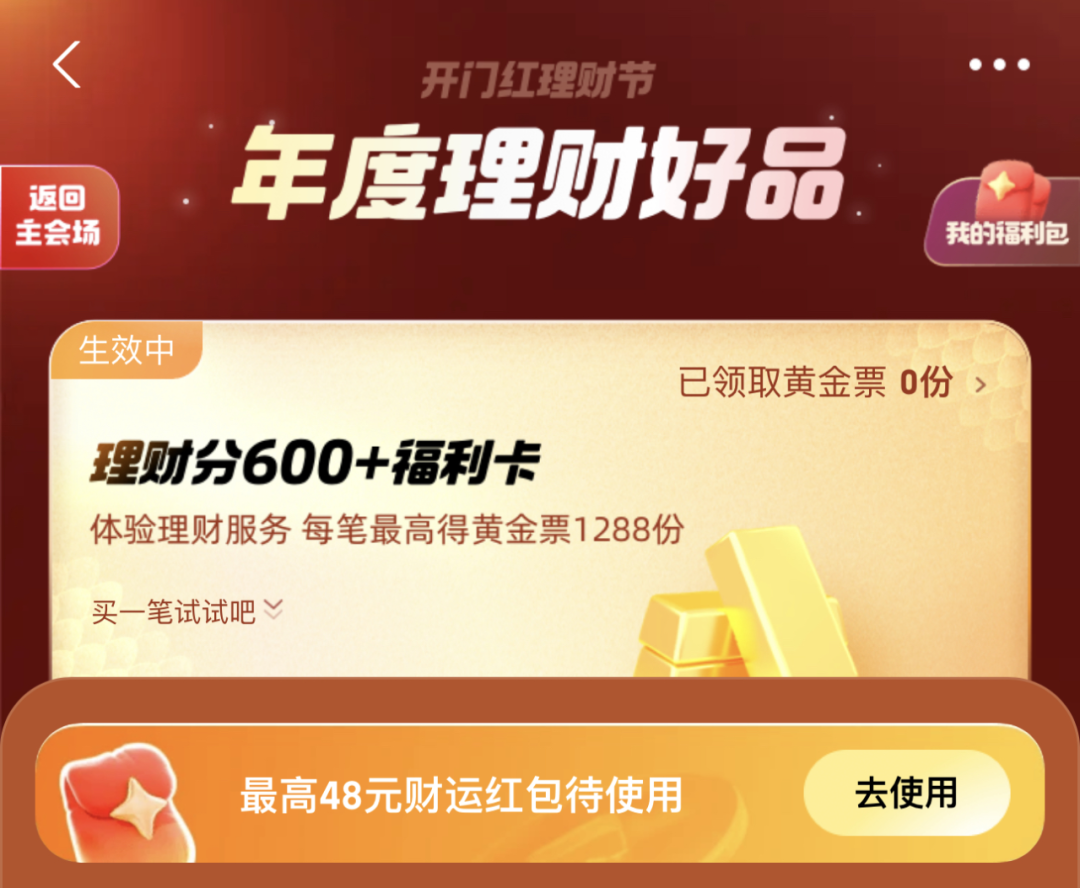 用户首次领取福利卡,可获得66份黄金票。在体验基金交易时,每完成一笔有效交易(不含余额宝、定投、个人养老金产品),系统将随机发放一定数量的黄金票,最高1288分。此外,用户与智能理财助理互动,体验相关服务也可一次性领取随机份额的黄金票。