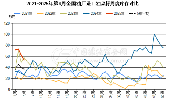 菜粕自身而言,截止到2025年第4周末,国内进口油菜籽库存总量为53.6万吨,较上周的62.4万吨减少8.8万吨,去年同期为26.5万吨,五周平均为67.4万吨。由于1月进口菜籽到港量明显下滑,菜籽库存也明显降低。且从买船情况来看,市场积极性仍然欠佳,据粮油商务网监测显示,2、3月进口菜籽到港预估分别为12万吨、17万吨。原料菜籽进口量大幅下滑,菜粕供应端压力也同步降低,或对市场价格有所支撑。且对于今年而言,气温总体高于往年同期,开春后温度回升,南方水产养殖启动时间有望提前,增添菜粕需求有向好预期。