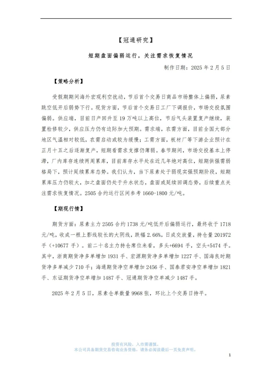 冠通研究--尿素策略:盘面承压偏弱震荡,关注下游跟进情况