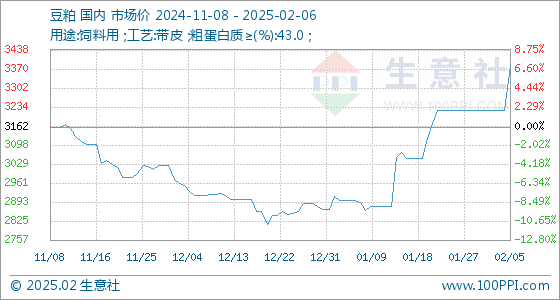 2月6日,生意社豆粕基准价为3382.00元/吨,与本月初(3222.00元/吨)相比,上涨了4.97%。
