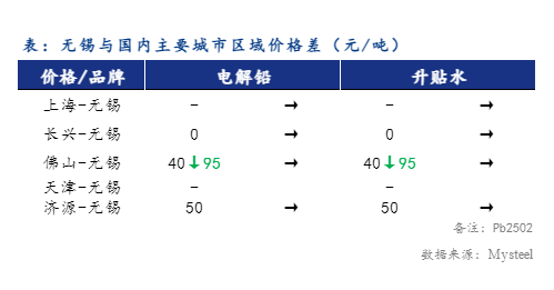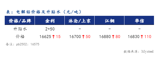 期铅震荡回升,其中上海市场贸易商红鹭牌对沪铅2502合约报升水150元/吨出厂,河南市场贸易商沪铅2502合约报升水50元/吨出厂,广东市场持货商报价16860-16980元/吨出厂。