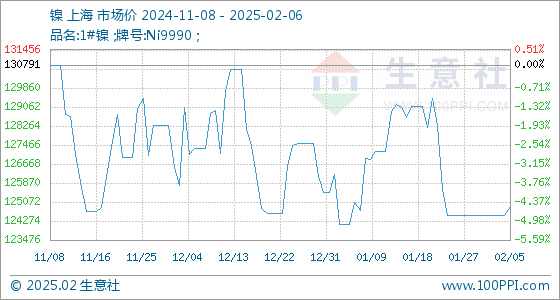 2月6日,生意社镍基准价为124900.00元/吨,与本月初(124516.67元/吨)相比,上涨了0.31%。
