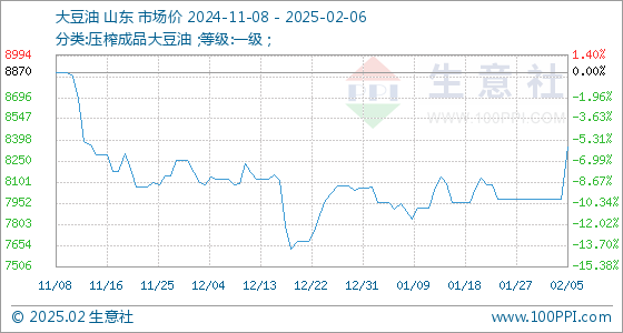 2月6日,生意社大豆油基准价为8350.00元/吨,与本月初(7978.00元/吨)相比,上涨了4.66%。