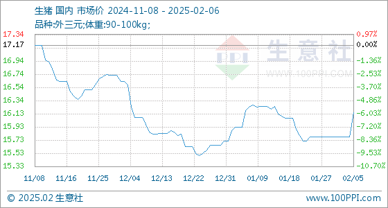2月6日,生意社生猪基准价为16.15元/公斤,与本月初(15.78元/公斤)相比,上涨了2.34%。