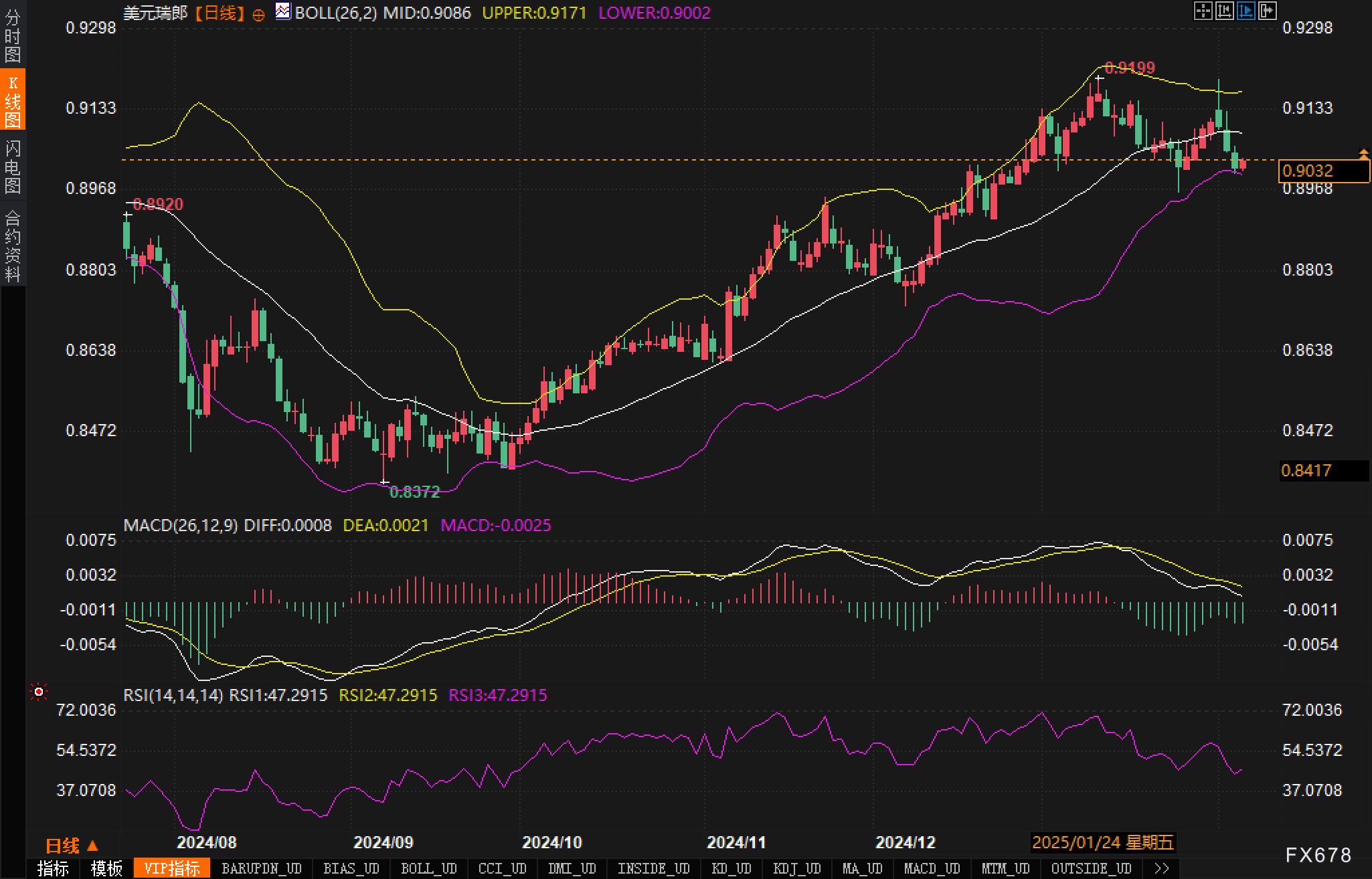 综上所述,美元/瑞郎当前的走势受到基本面和技术面的双重影响。尽管汇率在0.9000附近企稳,吸引了部分买盘,但市场对美联储降息的预期以及全球经济前景的担忧仍在一定程度上抑制了其上行空间。从技术角度来看,0.9000是一个重要的支撑位,如果汇率能够站稳在这一水平以上,可能会推动其进一步上行;反之,则可能会引发市场进一步抛售。
