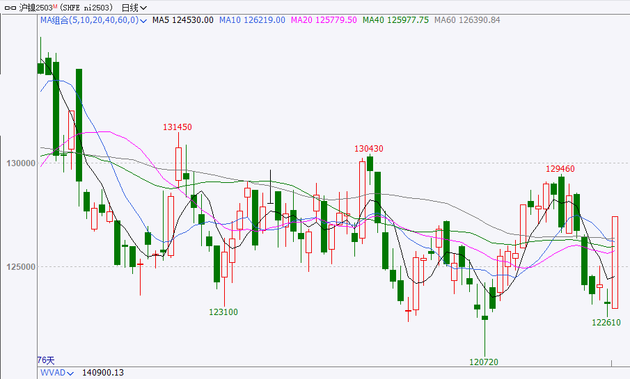 2月6日沪镍主力2503合约盘中一路走高,自低位大幅反弹,截止下午收盘报127400,涨幅3.39%