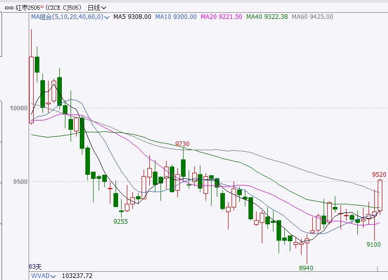 因库存压力减弱,节后存补货需求,今日红枣主力2505合约盘中一路走高,自低位开始走强,截止收盘报9510元/吨,涨幅2.48%