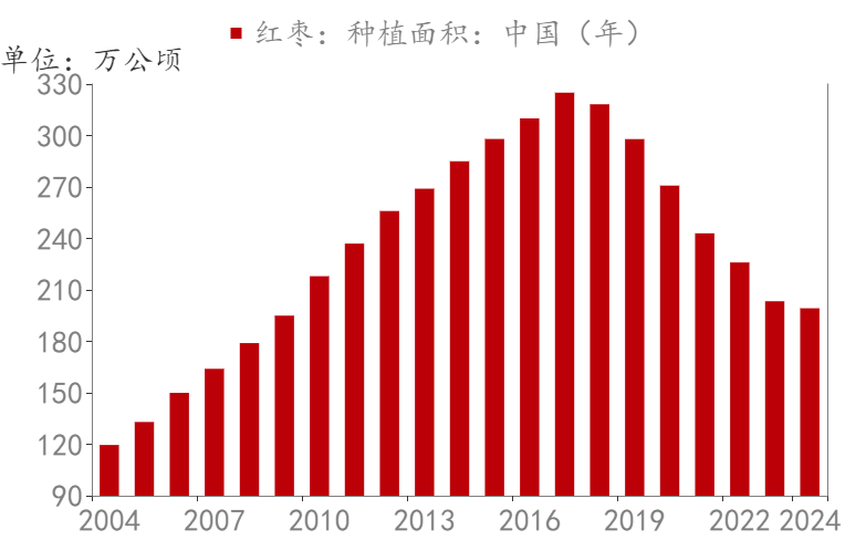 3、国内红枣种植面积持续下滑,据Mysteel农产品调研数据显示,国内红枣种植面积已连续8年下滑。