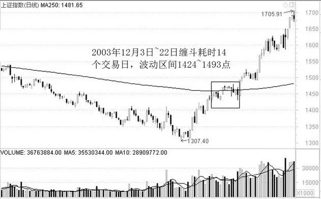 ◎2003年12月:年线方向刚拐头向上,沪指由1307点的市场低点反弹而起,碰触年线后与年线一番缠斗最终选择向上突破。