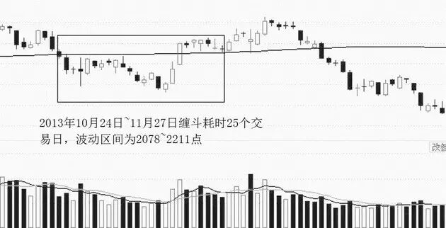 ◎2013年10月:年线方向趋平,在当年10月24日至11月27日的25个交易日里,沪指围绕年线震荡,虽然偶尔跃起,但是最后向下突破。
