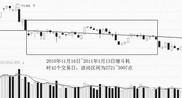 ◎2010年11月:年线方向向下,沪指在当年11月到次年1月围绕年线展开了长时间的波动,之后突然掉头向下,9个交易日小幅下跌5.1%。