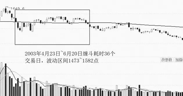 ◎2003年4月:年线方向明显向下,沪指从当年4月23日开始,与年线缠斗36个交易日,最终依然向下。