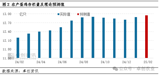 根据影响产蛋鸡存栏量的重要指标补栏量、出栏量、上月存栏基数等,可推断2月在产蛋鸡存栏量理论值为12.95亿只,环比增幅0.47%。2月份新开产的蛋鸡为2024年10月份补栏的鸡苗,根据前期统计数据来看,2024年10月份全国蛋鸡补栏量为8705亿只,虽环比减少2.73%,但仍处于较高水平。依据1月末老母鸡出栏日龄541天推断,2月份待出栏的老母鸡为18个月前补栏的鸡苗,但是由于春节前养殖单位多积极出栏老母鸡,大日龄蛋鸡数量减少,春节过后养殖单位出栏老母意向一般不高,因此实际出栏量或小于理论值,且部分或存换羽心态,导致实际存栏量或存在一定不确定性,仍需密切关注老母鸡出栏情况以及换羽情况。