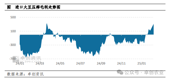 卓创资讯监测数据显示,本周进口大豆压榨企业理论毛利水平为盈利。本周(1月31日至2月6日)毛利均值为盈利197.56元/吨,较节前一周涨114.46元/吨,涨幅137.74%。从盈利构成要素看,周内进口大豆到港成本小涨,下游豆粕、豆油价格上涨。进口大豆成本均价3708元/吨,较节前一周涨6元/吨,涨幅0.16%;43%蛋白豆粕均价3366元/吨,较节前一周涨212元/吨,涨幅6.72%;全国一级豆油均价8429元/吨,较节前一周涨323元/吨,幅度3.98%。