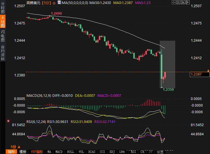 在宣布降息后,英镑兑美元(GBP/USD)立刻出现了剧烈波动,短线跳水近70点,最低触及1.2359。尽管最终稍有回升,但英镑日内的跌幅达到了0.90%,报1.2390。英镑兑日元也表现出类似的波动,跌幅为0.95%,报188.95。市场的反应反映出投资者对央行温和降息的谨慎态度以及未来货币政策可能进一步松动的预期。