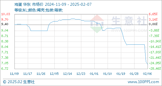 2月7日,生意社鸡蛋基准价为7.00元/公斤,与本月初(8.20元/公斤)相比,下降了-14.63%。